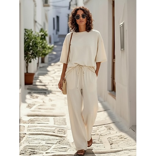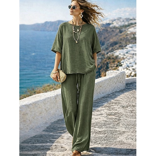 Completo pantaloni da donna in lino al 15%, completo in lino, tinta unita, tasca, elastico in vita, t-shirt, pantalone, casual, a maniche lunghe, girocollo, blu, nero, bianco, blu navy, marrone chiaro, estate, primavera