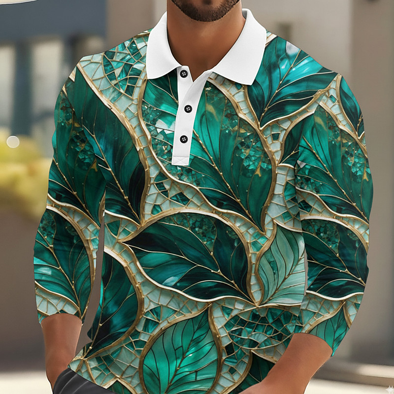 Men's Leaf Abstract Polo Long Sleeve Polo Shirts Lapel Casual Outdoor Street Athleisure Daily Wear 3D Print Buttons Spring Fall Winter Blue Purple Green