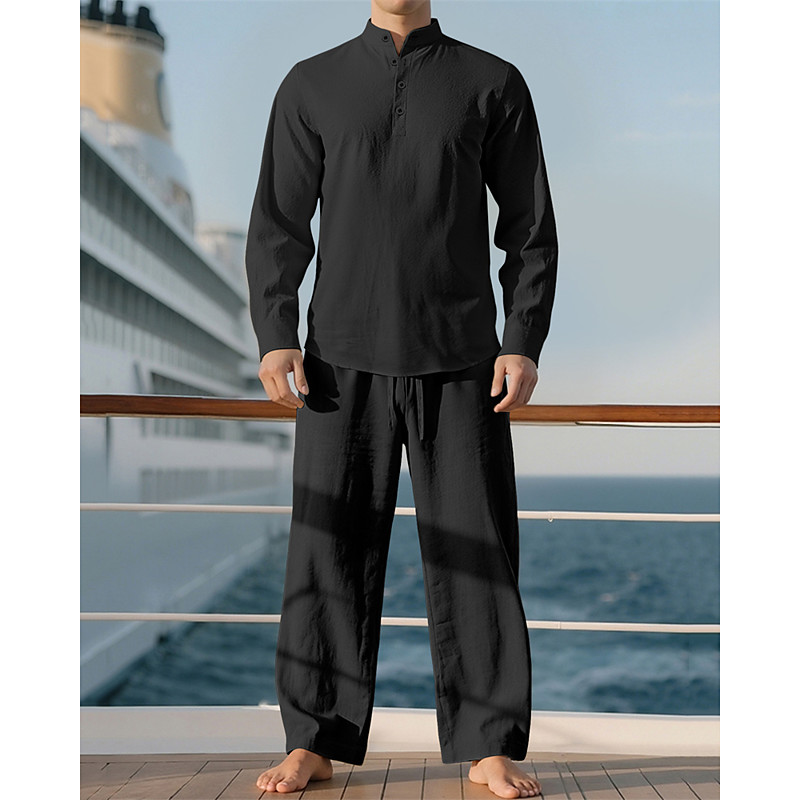 Men's T-shirt Suits Shirt and Pant Sets 2 Pieces Outfits Long Sleeve Lapel Spring Fall Plain Fashion Casual Jacquard 2 Piece Vacation Daily Wear Going out Black White Khaki Top Tee for Men