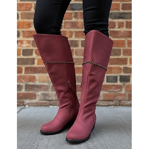 stivali alti fino al ginocchio in similpelle marrone scuro da donna: eleganti stivali con tacco basso per outfit autunnali e invernali