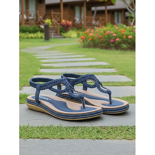 sandali infradito intrecciati blu navy da donna - comodi sandali bassi con cinturino e supporto plantare, eleganti scarpe estive bohémien per passeggiate in resort, vacanze tropicali giro turistico