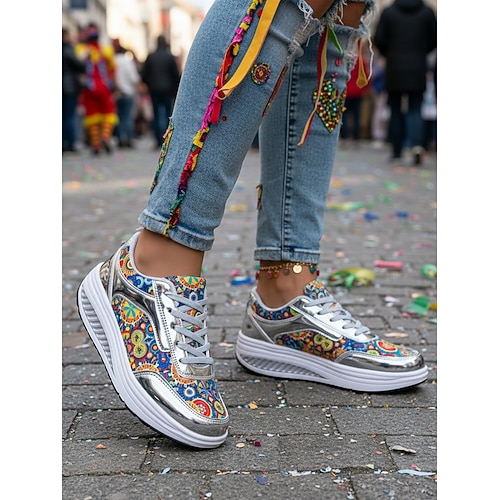 sneakers da donna con plateau in metallo dorato e stampa paisley colorata – scarpe da passeggio con suola a dondolo lucida per balli, feste e festival di carnevale