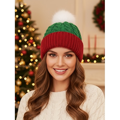 Weihnachtsmütze mit Zopfmuster und Bommel für Damen, festliches Grün und Rot, perfekt für die Weihnachtszeit