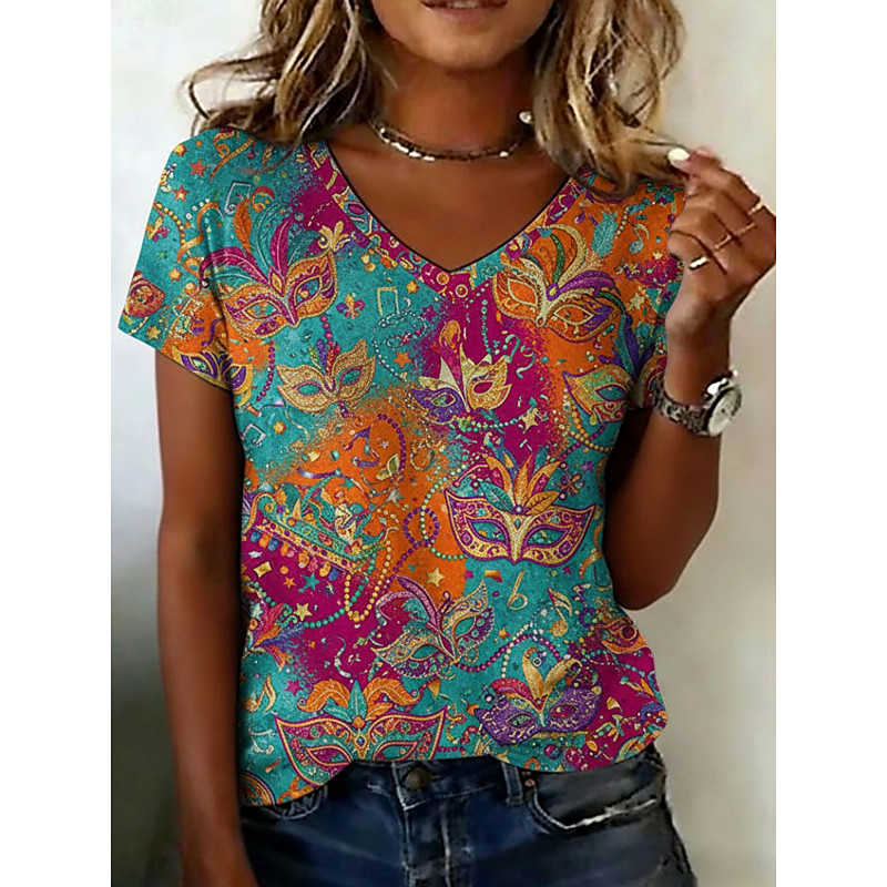 Carnival Women's T Shirt Graphic Abstract Vintage Casual Short Sleeve V Neck Regular Tops Daily Weekend Vacation Wear Print Blue Summer Spring