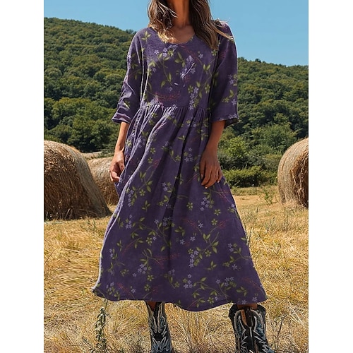 Abito maxi da donna in lino simile Abito boho casual Bohemia Vacanza Spiaggia Vestibilità comoda Floreale Grafico Astratto Maniche 3/4 Collo rotondo Rosa Viola Arancione Estate Primavera Autunno