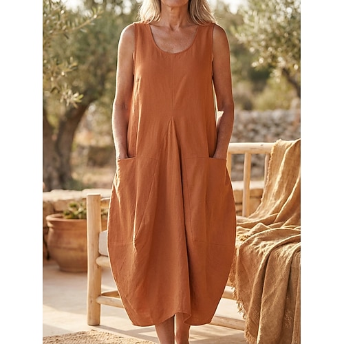 Per donna Abito Midi Finto cotone e lino Abito a Tubino Casual Quotidiano Vestibilità comoda Semplice Manica Corta Girocollo Vino Kaki Grigio Estate Primavera