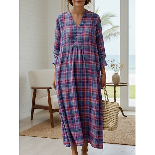 Per donna Abito Midi Vestito Casual Abito a Tubino Vintage Quotidiano All'aperto Vacanza Vestibilità comoda Plaid Manica Lunga Scollo a V Blu Viola Verde Estate Primavera Autunno