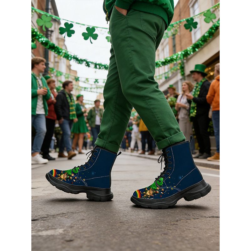 Men's St. Patrick's Day Boots with Shamrocks - Stylish Green Boots with Gnome and Gold Coin Design, Perfect for Parades and St. Patrick's Celebrations