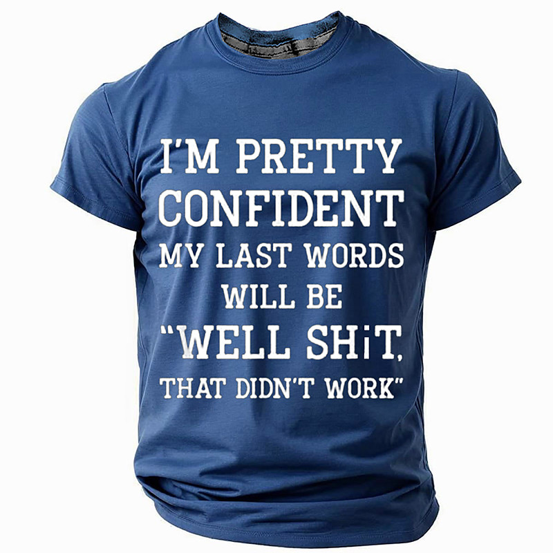 Men's Funny Graphic T-Shirt, Sarcastic Last Words Quote 'I'm Pretty Confident My Last Words Will Be Well Shit, That Didn't Work' Short Sleeve Tee