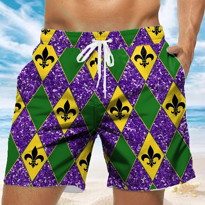 Mardi Gras Men's Rhombus Carnival Mardi Gras Fleur De Lis Swim Trunks Swim Shorts Board Shorts Mid Waist Fashion Casual Party Holiday Side Pockets Mesh Lining Elastic Drawstring Waist Designer