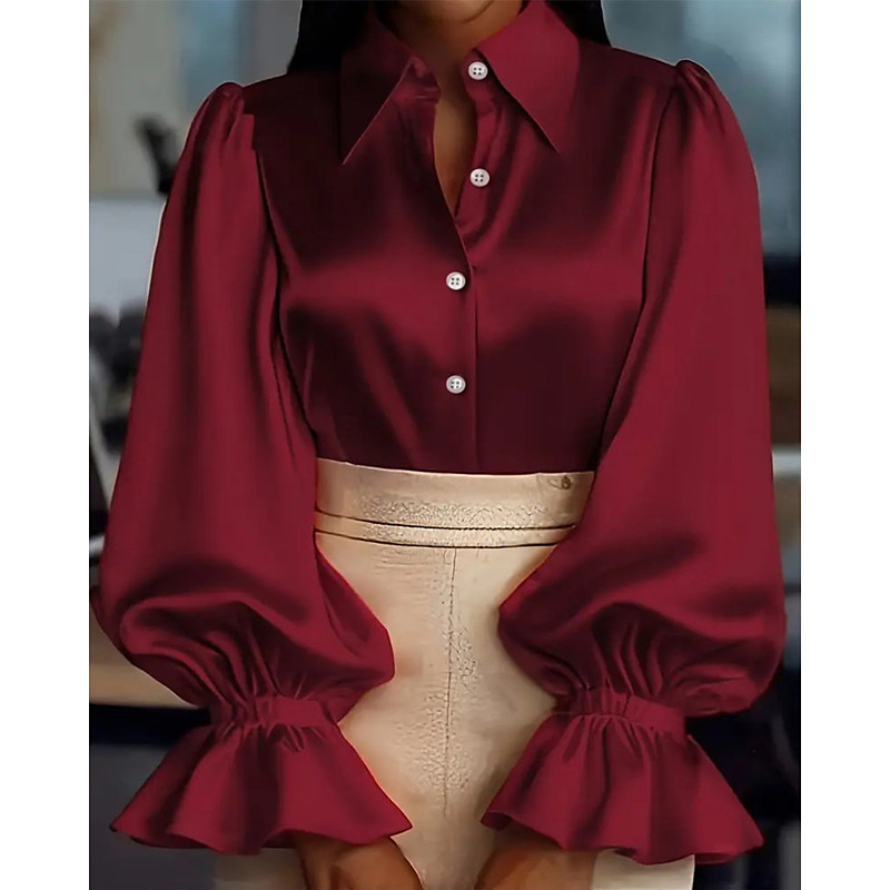 Women's Shirt Elegant Dressy Satin Solid Color Plain Elegant Vintage Cute Long Sleeve Puff Sleeve Shirt Collar Regular Tops Work Daily Holiday Ruched Patchwork Buttons Black Pink Wine Green Apricot