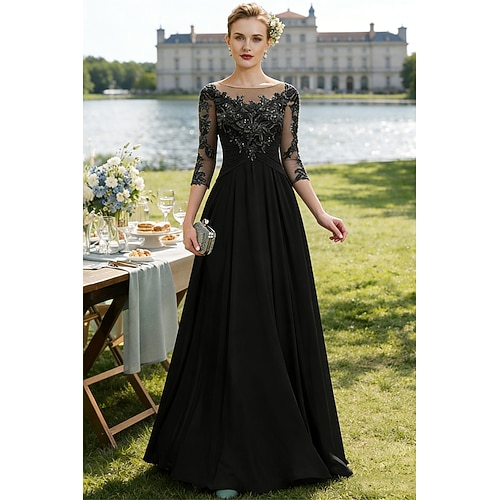 Linea ad A Lunghezza al pavimento Abito da invitata a nozze Abito Formale Abito da sera Abito da cerimonia per signora Manica 3/4 Collo gioiello Elegante Ricevimento di matrimonio Chiffon Pizzo con