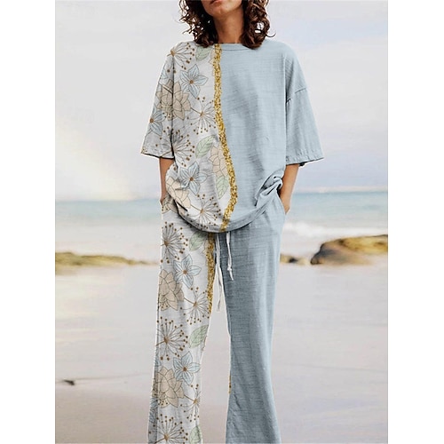Per donna Attivo Moda Set di Pantaloni Manica 3/4 Girocollo Floreale Stampato Vacanza Quotidiano Ferie Blu Estate Vestibilità regolare