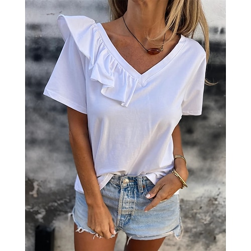 Per donna Camicia Blusa Tinta unica Informale Manica corta A V Top regolari Giornaliero Con balze Nero Bianco Blu Verde Grigio Estate
