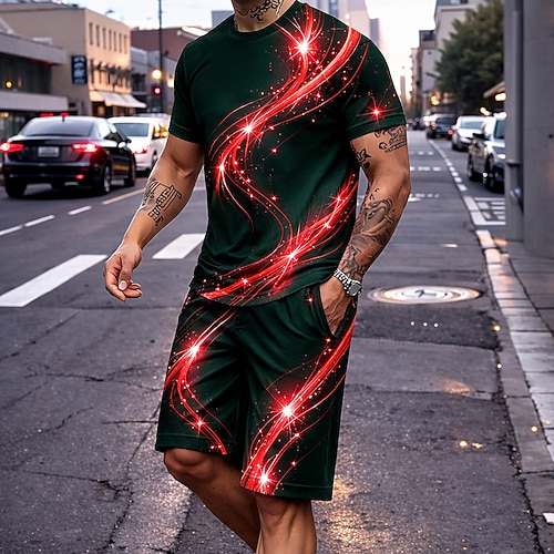 Herren Geometrisch 2St T-Shirts-Sets Sommeroberteile Kurzarm Kurze Hosen Rundhalsausschnitt Alltagstauglich Urlaub Sport Ausgehen 3D-Druck Sommer Blau Rote Gold