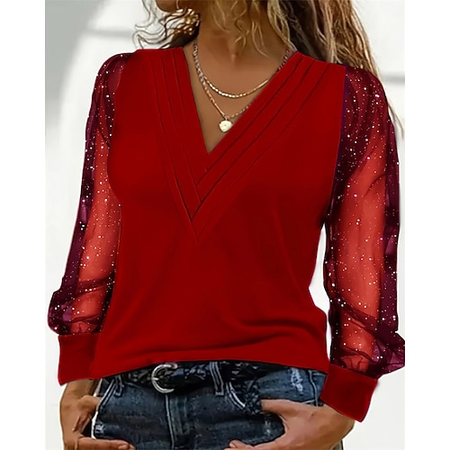 Per donna Top estivi Blusa Top Eleganti Semplice Elegante Vintage Signore Manica Lunga Scollo a V Top Regolari Quotidiano Lavoro Ferie Arricciato Patchwork Glitter Nero Rosso Blu Reale Estate