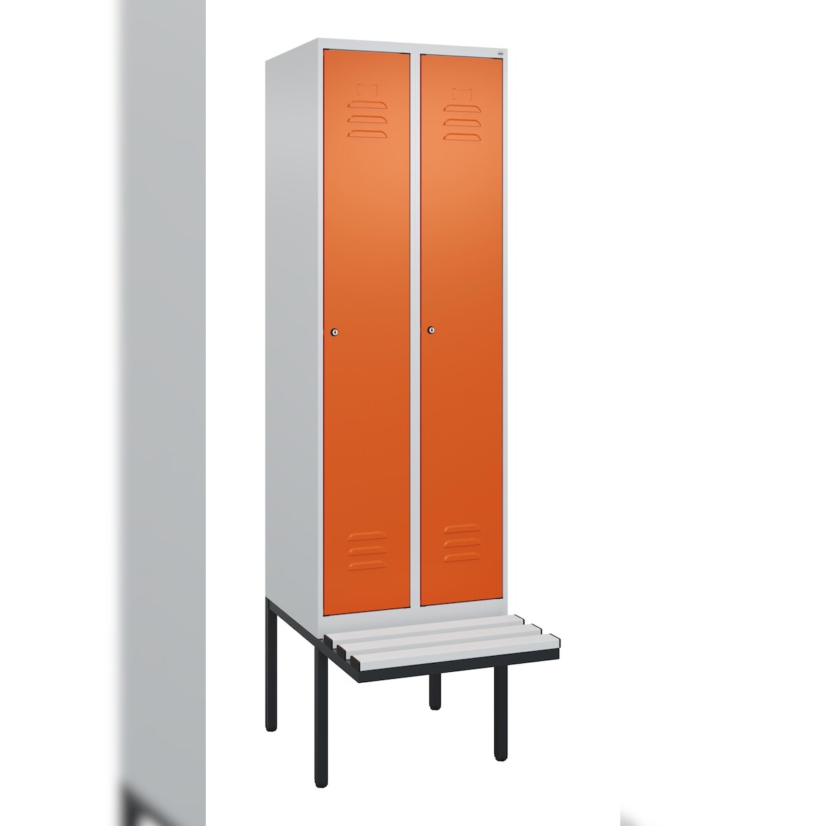C+P Spind Classic PLUS, Kunststoff schwebende Sitzbank, 2 Abteile, HxBxT 212x60x82cm, Zylinderschloss, Hellgrau/Reinorange von PROREGAL