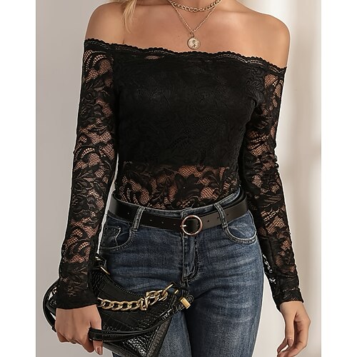 Per donna Blusa Top in pizzo Semplice Elegante Sexy Manica Lunga Senza Spalle Top Regolari Quotidiano Ferie Uscire Pizzo Nero Bianco Vino Estate Primavera