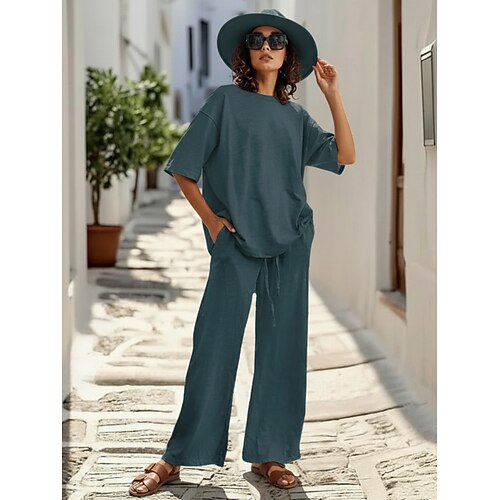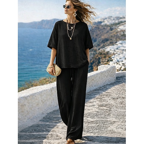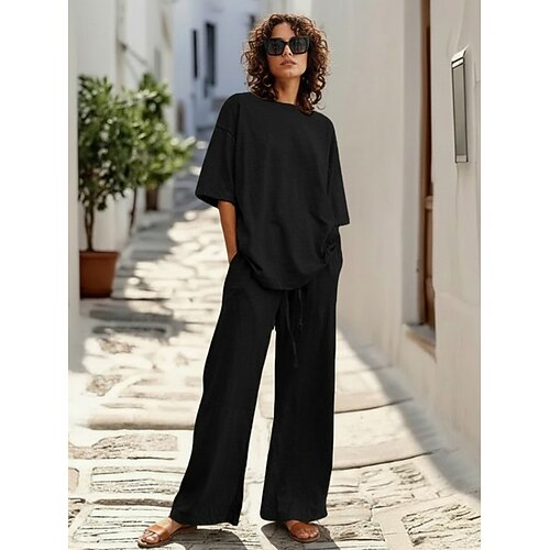Completo pantaloni da donna in lino al 15%, completo in lino, tinta unita, tasca, elastico in vita, t-shirt, pantalone, casual, a maniche lunghe, girocollo, blu, nero, bianco, blu navy, marrone chiaro, estate, primavera