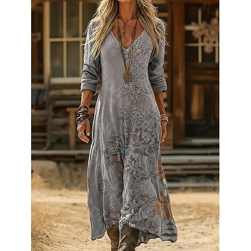 Per donna Abito Midi Abito Boho Abito Vintage Vestito Casual Vintage Quotidiano All'aperto Vacanza Vestibilità comoda Floreale Manica Lunga Scollo a V Nero Viola Verde Grigio Primavera Autunno