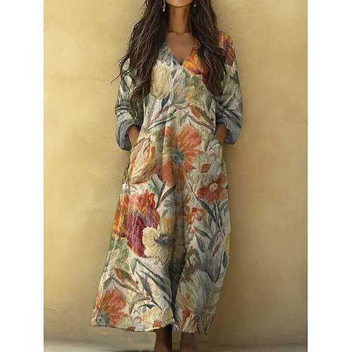 Per donna Abito Midi Abito a Tubino Casual Quotidiano Uscire Vestibilità comoda Floreale Grafico Manica Lunga Scollo a V Rosa Viola Verde Autunno Inverno