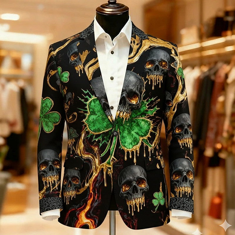 St. Patrick Men's Skull Shamrock Blazer Jacket Coat Fashion Comfortable Breathable Artistic Casual Daily Party Evening Wear Festival Pocket 3D Print Buttons All Seasons Notch Long Sleeve Black Gray