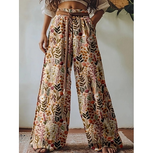Per donna Gamba larga Vacanza Vintage Stile Etnico Lunghezza intera Vita Alta Floreale Grafico Inelastico Formale Vacanza Streetwear Marrone scuro Bianco latte Bianco Estate Primavera Vestibilit