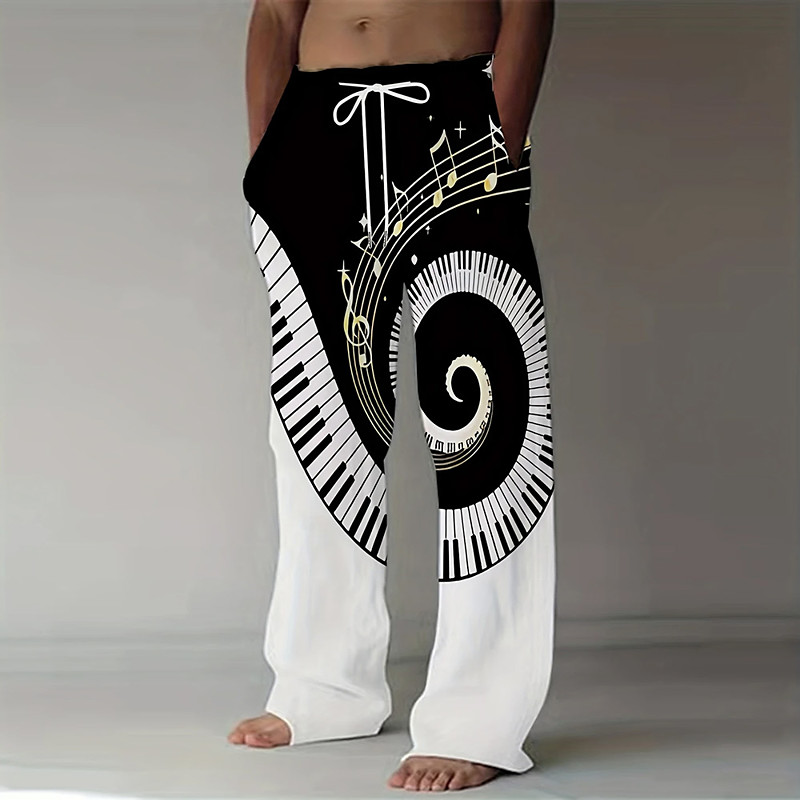 Men's Piano Musical Notes Swirl Trousers Baggy Pants Casual Pants Mid Waist Vintage Retro Outdoor Vacation Elastic Drawstring Waist Linen-Like Pants with Pockets Summer Spring 3D Print Black White
