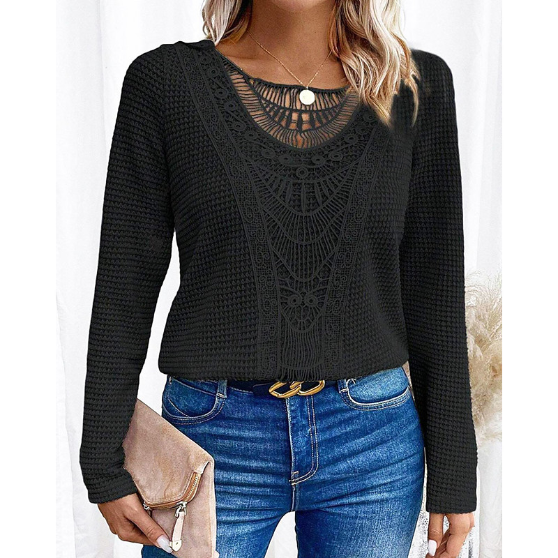 Women's Blouse Plain Vintage Stylish Long Sleeve Crew Neck Regular Tops Daily Holiday Going out Lace Patchwork Black White Pink Wine Navy Blue Spring Fall