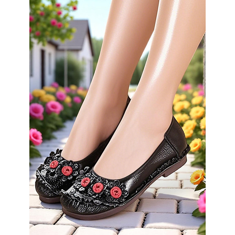 Women's Premium Leather Flats with Floral and Ruffled Design – Retro Comfortable Style for Spring Garden Walks, Weekend Brunch Daily Errands