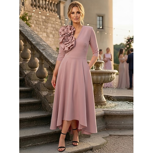 Linea ad A Lunghezza alla caviglia Abito Formale Abito da cerimonia per signora Manica 3/4 Scollo a V Elegante Vintage Formale Ospite di nozze Riunione di famiglia Crepe Elasticizzato con Fiori 3D