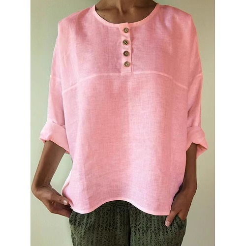 Per donna Camicie di cotone e lino Elegante Bohemien Vintage Manica Lunga Girocollo Top Regolari Quotidiano Ferie Bottoni Rosso-arancio Nero Bianco Rosa Azzurro cielo Estate Primavera Autunno Inverno