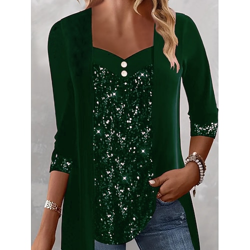 Blusa Donna Natale Colore Solido Elegante Stile Base Maniche Lunghe Collo Quadrato Top Regolari Quotidiano Paillettes Patchwork Nero Vino Viola Verde Primavera Autunno Inverno