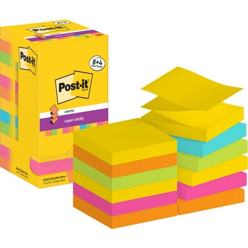 Post-it Super Sticky Z-Notes Haftnotizen R330-SSCARN-P8+4 76 x 76 mm 90 Blatt pro Block Blau, Gelb, Grün, Orange, Rosa 12 Stück (8 + 4)