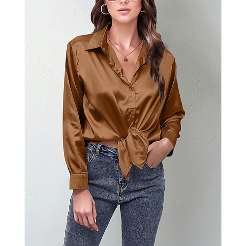 Per donna Camicia Elegant Elegante Raso/Satin Tinta unica Elegante Essenziale Casual Manica Lunga Colletto a Camicia Top Regolari Quotidiano Uscire Bottoni Bianco Giallo Blu Reale Viola chiaro Marrone