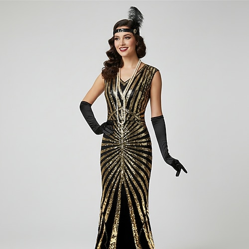 Set Il grande Gatsby Lunghezza alla caviglia Lunghezza lunga Vestito Abiti Abito da sera con accessori Cortissima Il grande Gatsby Invitato al matrimonio Paillettes Paillettes Scollo Tondo Costume