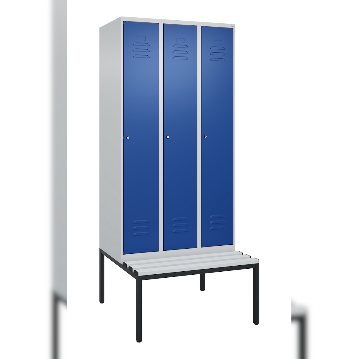 C+P Spind Classic PLUS, Kunststoff untergebaute Sitzbank, 3 Abteile, HxBxT 212x90x82cm, Zylinderschloss, Hellgrau/Enzianblau von PROREGAL