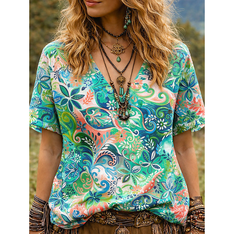 Women's T Shirt Floral Graphic Geometric Vintage Stylish Classic Short Sleeve V Neck Regular Tops Daily Weekend Vacation Wear Print Blue Red Orange Brown Summer Spring