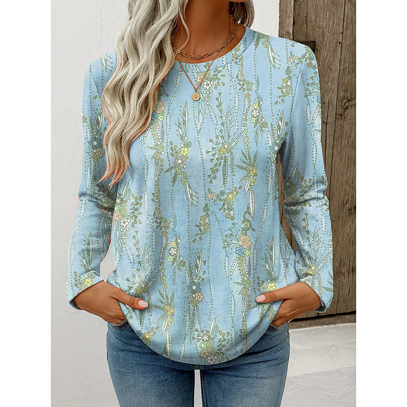 Women's T Shirt Floral Graphic Plants Vintage Stylish Classic Long Sleeve Crew Neck Regular Tops Daily Weekend Print Blue Pink Purple Green Spring Fall