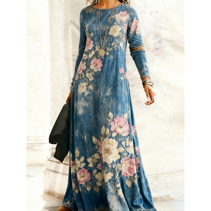 Women's Long Dress Maxi Dress Casual Dress Swing Dress Boho Dress Vintage Daily Outdoor Weekend Regular Fit Floral Long Sleeve Crew Neck Blue Spring Fall Winter