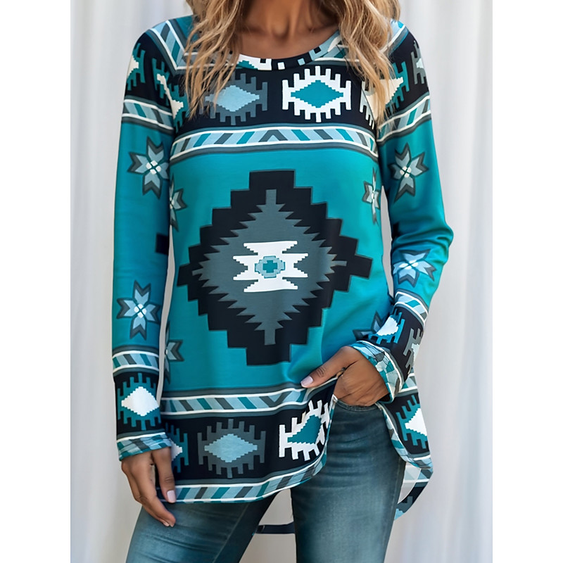 Women's T Shirt Graphic Geometry Vintage Stylish Casual Long Sleeve Crew Neck Regular Tops Daily Print Blue Gray Fall Winter