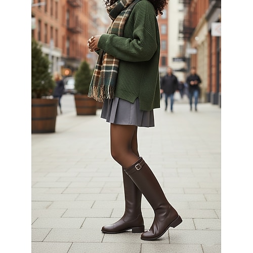 stivali alti fino al ginocchio in similpelle marrone scuro da donna: eleganti stivali con tacco basso per outfit autunnali e invernali