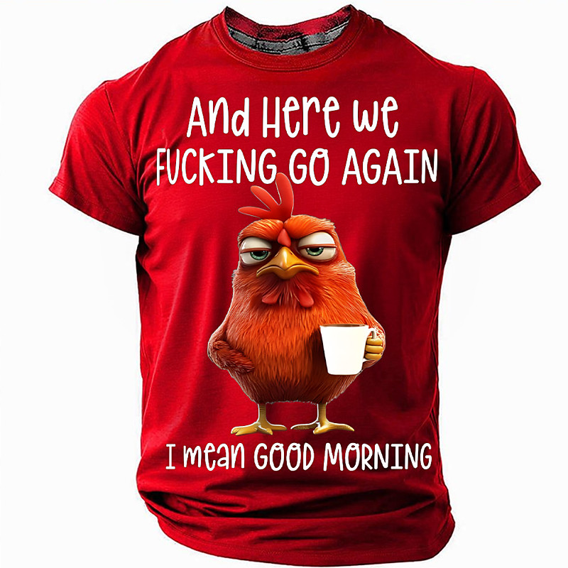 Mens Graphic T-Shirt: Funny Grumpy Chicken 'Here We Fing Go Again I Mean Good Morning' Lifestyle Humor Tee