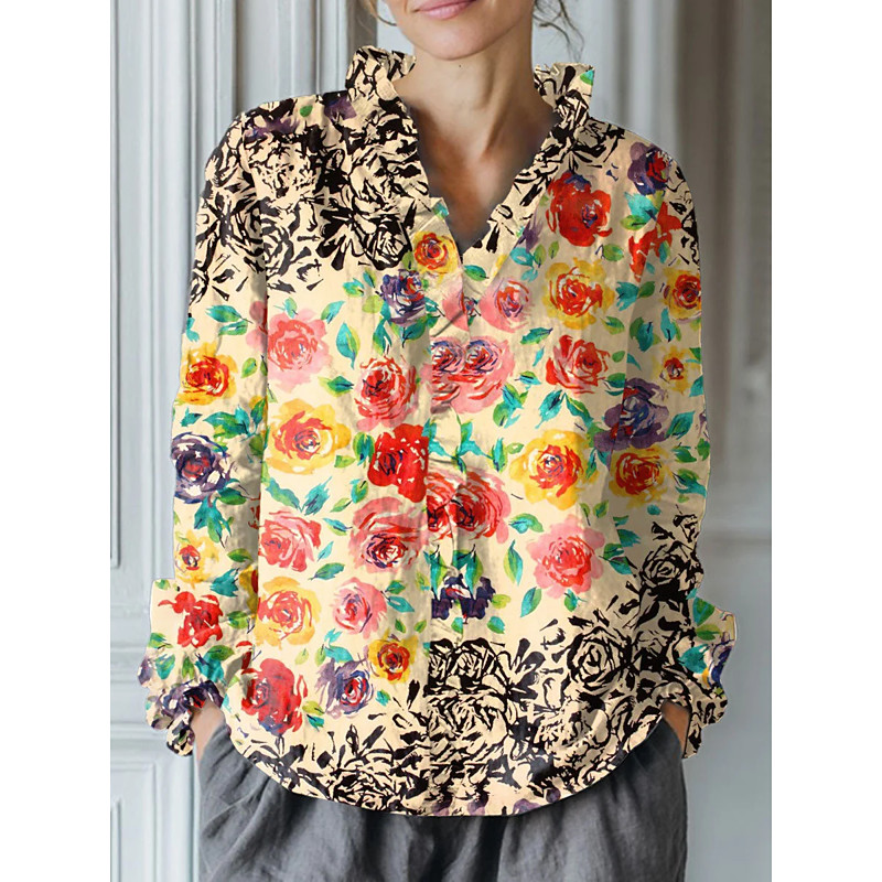Women's Boho Shirt Floral Graphic Elegant Vintage Daily Long Sleeve V Neck Regular Tops Daily Work Holiday Ruched Ruffle Yellow Green Summer Spring Fall Winter