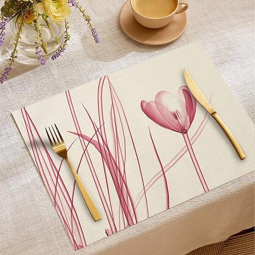 Tovaglietta da tavola rettangolare in tessuto con motivo a tulipani rosa, 100% poliestere, con disegno astratto di piante verdi, lavabile in lavatrice e resistente al calore, protegge la superficie