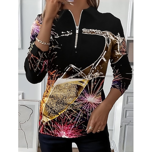 Felpa con cappuccio da donna per capodanno, con cerniera, grafica, moda attiva, casual, manica lunga, girocollo, top normali, street, abbigliamento quotidiano, casual, cerniera, stampa, nero,