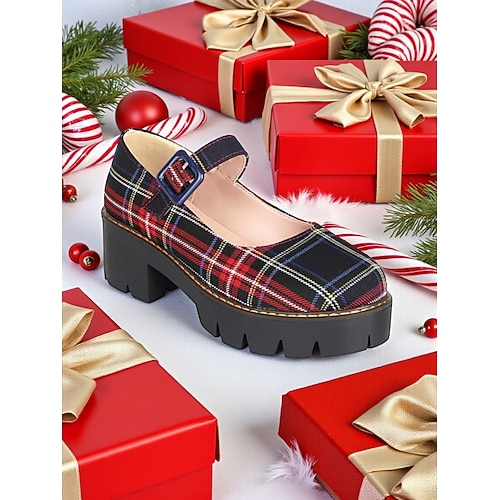 scarpe da donna con plateau Mary Jane a quadri rossi e fibbia - stile natalizio festoso, perfette per outfit festivi e celebrazioni natalizie