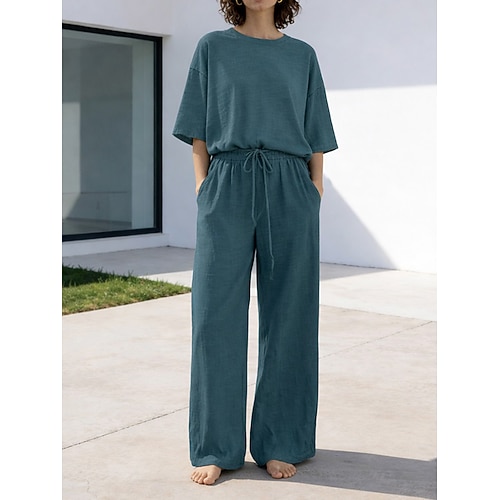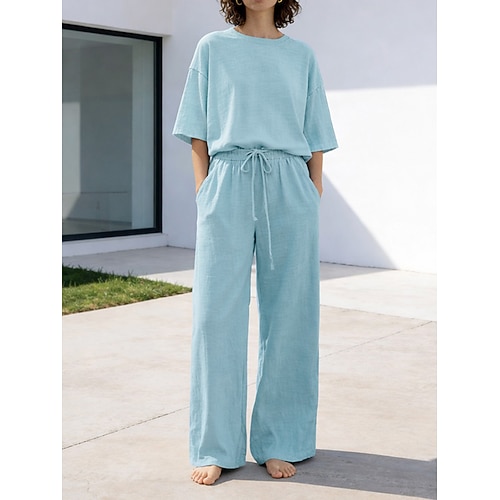 15% lino set da donna in lino misto lino set due pezzi basic colore puro tasca elastico in vita maglietta pantaloni strada quotidiano manica lunga girocollo nero bianco blu navy marrone chiaro blu estate primavera