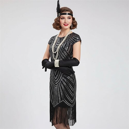 Retrò Vintage Anni Ruggenti Anni 1920 Lunghezza al ginocchio Abito Flapper Abiti Set di accessori Maniche corte Il grande Gatsby Invitato al matrimonio Paillettes Frangia con nappe Paillettes Nappa