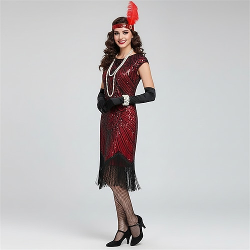 Anni Ruggenti Anni 1920 Abito da cocktail Midi Abito Flapper Abito da cocktail Set di accessori Senza maniche Il grande Gatsby Invitato al matrimonio Paillettes Frangia con nappe Scollo a V Costume